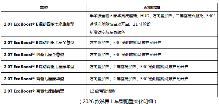 2025年10月1日,沈陽國際車展福特展臺迎來2026款福特銳界L升級上市:此次升級共推出7款配置車型,官方指導價22.98萬—30.98萬元;