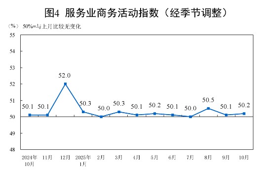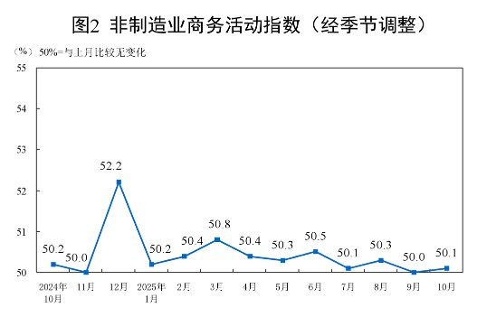 10月份,非制造業(yè)商務(wù)活動(dòng)指數(shù)為50.1%,比上月上升0.1個(gè)百分點(diǎn),升至擴(kuò)張區(qū)間。