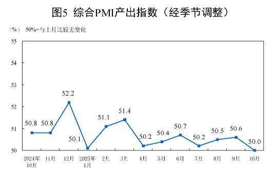 10月份,綜合PMI產(chǎn)出指數(shù)為50.0%,比上月下降0.6個(gè)百分點(diǎn),位于臨界點(diǎn),表明我國企業(yè)生產(chǎn)經(jīng)營活動(dòng)總體穩(wěn)定。